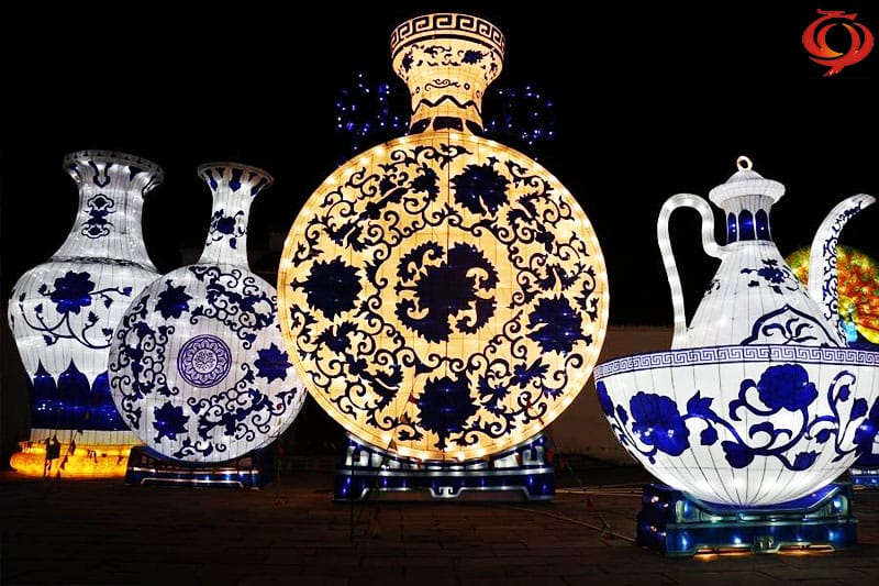 青花瓷又称白地青花瓷,常简称青花,是中华陶瓷烧制工艺的珍品,朴素淡雅却又不失高贵。位于地池之畔的“中华国粹-青花瓷瓶”灯组,相比其它花灯,给人以格外精致之感。青花瓷瓶彩灯灯组充分展示了独特的陶瓷艺术的美,抽象青花瓷瓶造型为设计出发点,将中国古典元素与节日气氛完美融合,全部采用冷光源LED灯泡组成的花灯,不仅以光雕的方式完美呈现了中华国粹元青花的雅致和精美,而且更加节能环保,是花灯制作工艺的新尝试。