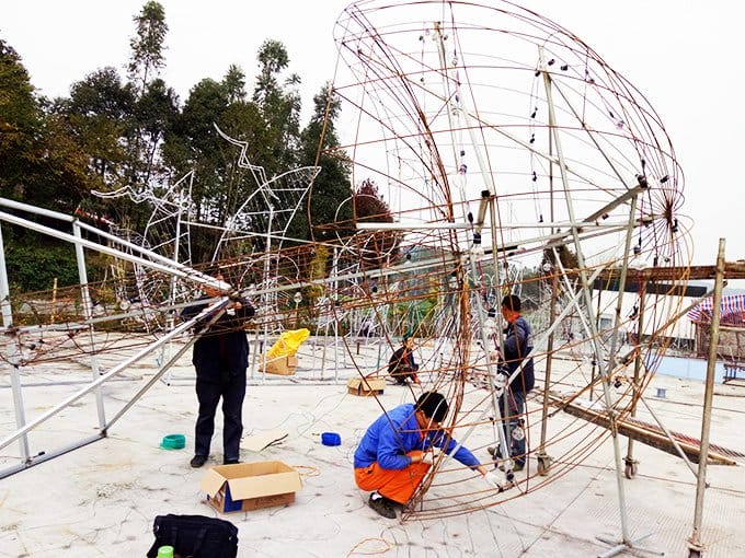 6、组装固定:美工按着彩灯设计图纸(施工图),指挥工人将灯组各部位组装到位。用铁丝、元丝等绑接各部分,必要的需在地面打膨胀螺丝,焊接在灯组上(或放沙袋、风绳加固)。此时,电工得及时连接各部位的电线,确保各部位的灯具均能发光。