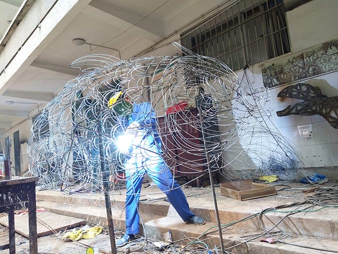 2、丝架焊接造型:钳工通过扳、锤、剪、弯、焊等工艺,用铁丝、元丝等弯成美工画出来的图形线,再焊接、牵丝、加固、支撑等,使之变成三维的、立体的、多角度观赏的丝架造型。
