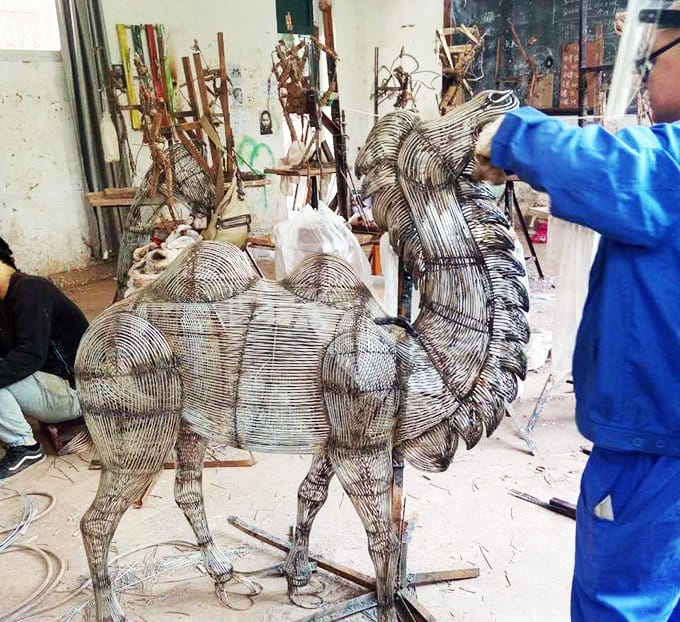 学生在焊接丝架时应适当概括形体,这是由铁丝(元丝)的属性决定的,市场上销售的铁丝(元丝)有一定的韧性和一定的粗度。做大型的丝架可以用元丝,中型的可以用8#、10#铁丝,小型的则用12#、14#铁丝。丝的属性导致在制作复杂形体时有着很强的局限性,特别是小型的丝架,丝架越小,难度越大,细节越不好表现。所以需要学生灵活处理,适当的进行归纳,保留大的形体,舍去小的结构。
