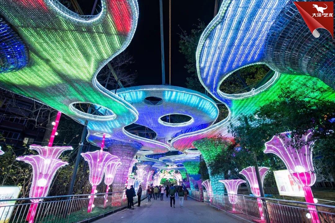 壮观。置身其间,仿若进入璀璨晶莹的世界。灯组长46米,距地面5米高的彩云,错落交叉布局,覆盖10米宽的通道。仅制作顶部