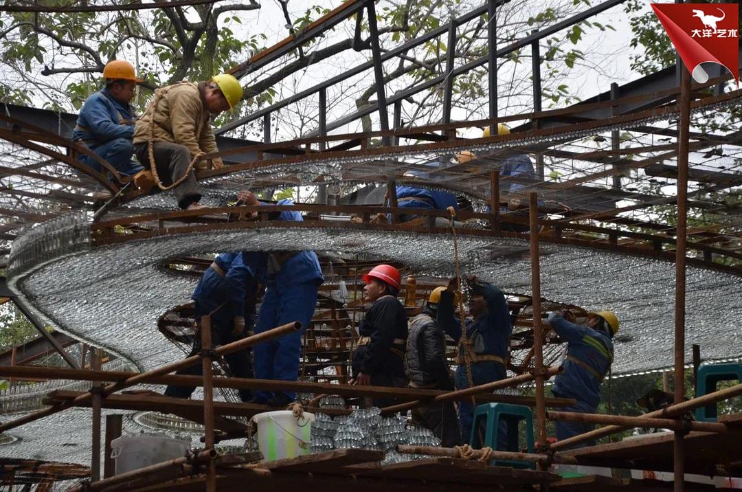 彩云的青霉素玻璃药瓶灯就达30多万个,灌水后达到12吨重;制作立柱的啤酒瓶达5000多个。