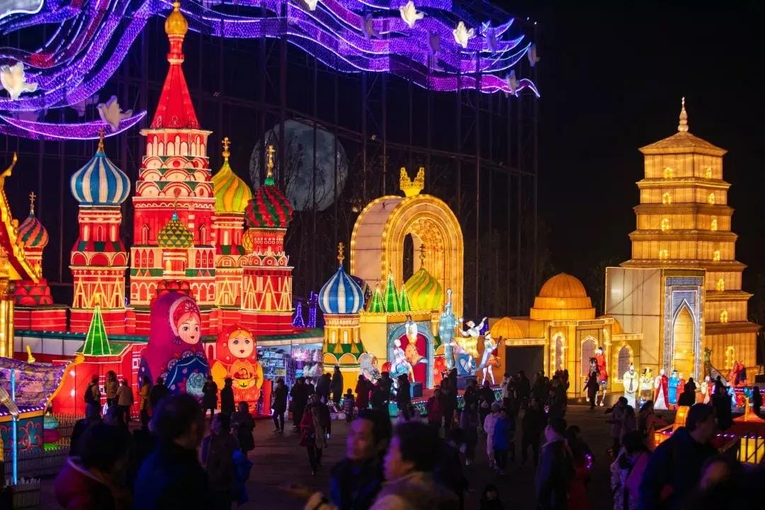 灯会入口,《万家灯火》大型组合式门灯由来自世界各地的1万盏灯笼组成,灯笼以组群式组成灯笼阵,展示世界各国的彩灯风情。其中,以中国八大非遗花灯和中国灯具演化为核心组团,各式海外花灯为特色组团,让人们充分领略世界各地的彩灯风情,看见光明与希望。而巨大的灯笼灯阵,形成强有力视觉冲击力,更让观众领略到自贡灯会的精湛技艺和高大震撼。