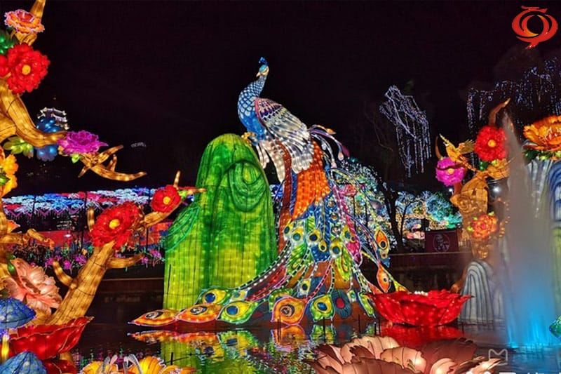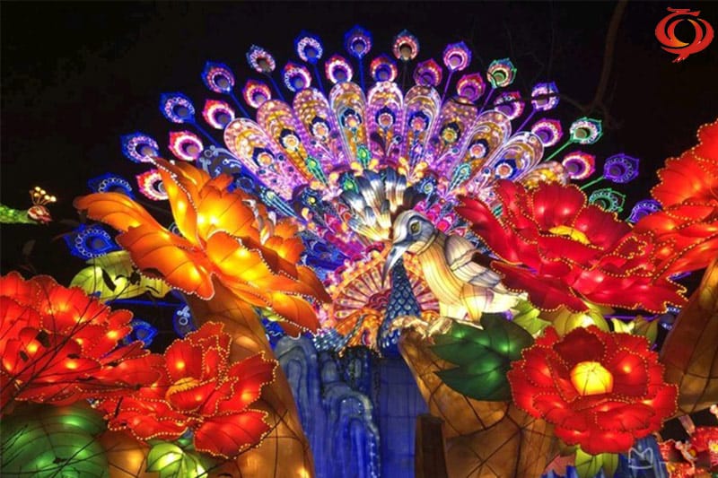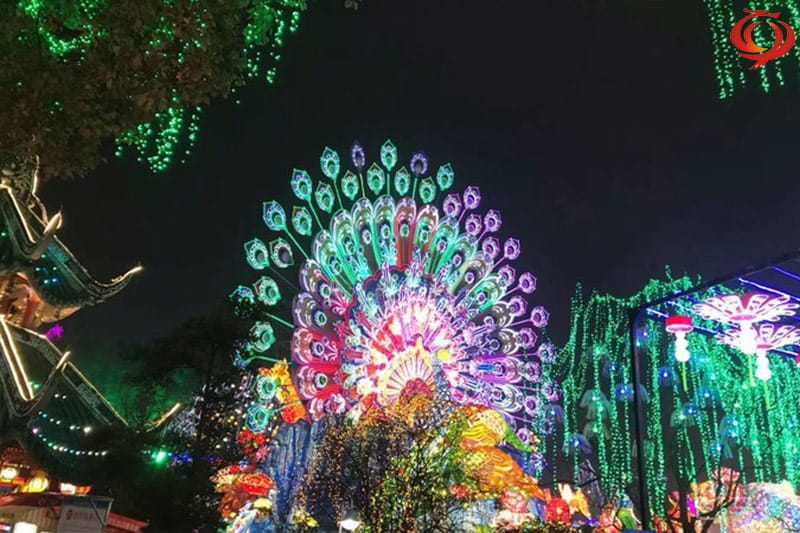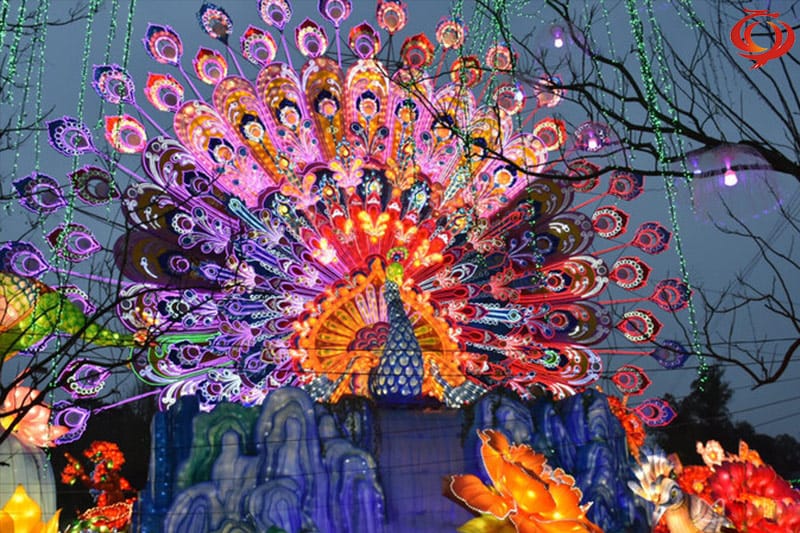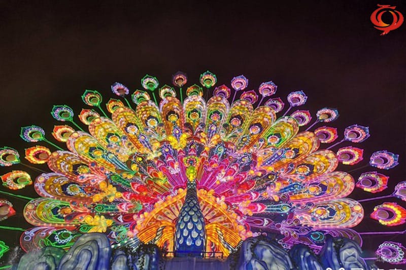 孔雀开屏花灯采用钢架结构、立体造型、内光源、部分喷绘、美术处理。采用传统花灯制作工艺及现在新工艺、现代新型光源材料有机的结合,完美体现出形、色、声、光、动、灯会的五大主体持色,集观赏性、游乐性、参以性一体,它同样生动有趣光彩夺目。它承载花灯艺术全新的装扮以新的造型出现,特别适用于节日添彩、狂欢造势和企业宣传、景区景点夜景灯饰、景区景点夜景灯光灯饰标志性建筑。