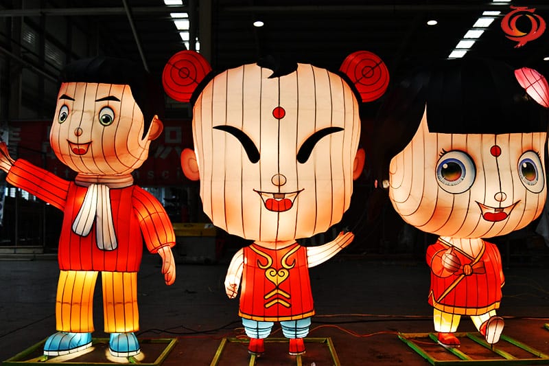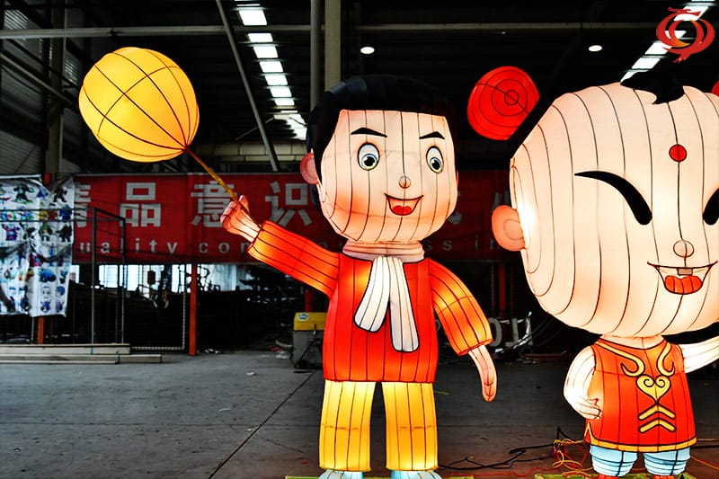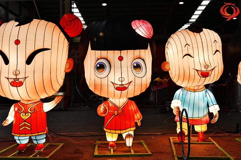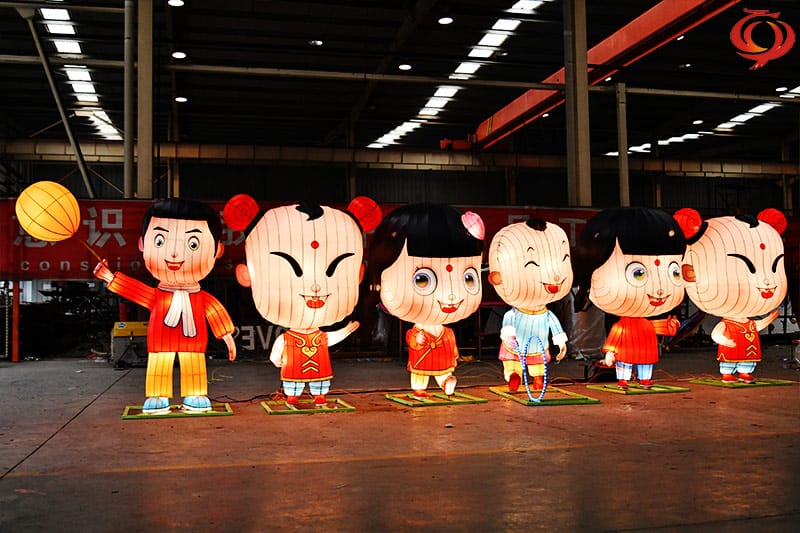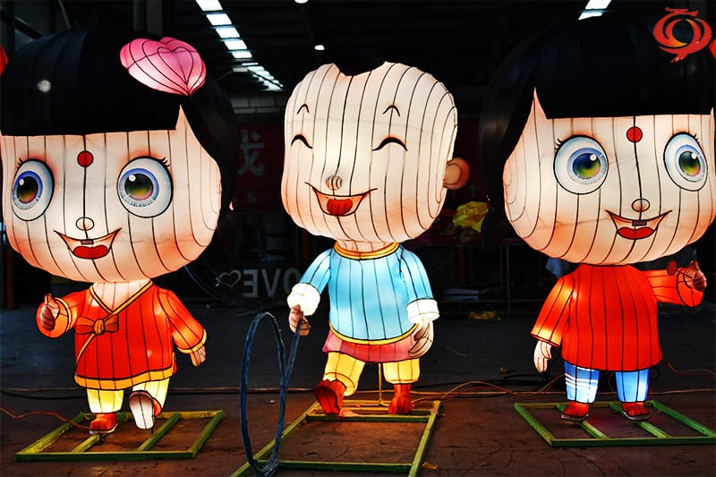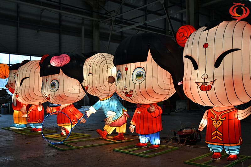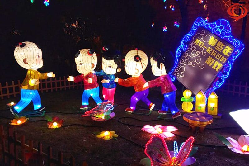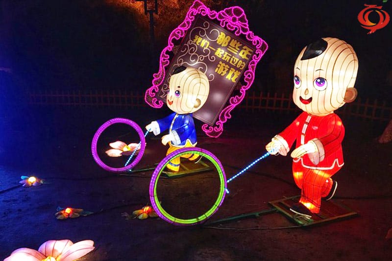 儿童主题花灯,该组花灯主题为童趣,讲述了80、90后小时候玩过的一些游戏,例如滚铁环、丢沙包、捉迷藏等等,现在很多小孩可能见都没见过这种游戏了,相信这组灯能够勾起很多人小时候美好的回忆。