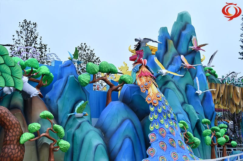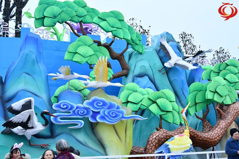 灯组描绘的是祖国秀美的大好河山。山峦纵横、苍松翠柏、飞瀑流泉川流其间,仙鹤起舞,流泉飞珠,宛如一轴清新秀美、吉庆祥和、华贵典雅的瑰丽画卷。秀美的造型纯净的色彩、优美的灯光艺术,灯景交融,清新脱俗,展示了传统彩灯制作的精良工艺水平,成为绝美的彩灯工艺佳作。