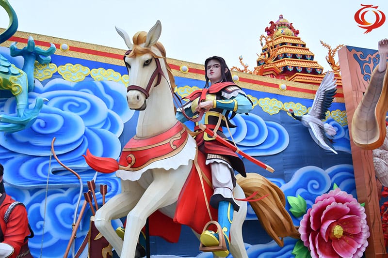 灯组是以我国古代历史上的“四大美女”和“四大女将”为创意原型,古代四大美女分别是西施,王昭君、貂蝉杨玉环,古代四大女将分别是花木兰、穆桂英、秦良玉、冯婉真。灯组用一幅巨大的画卷将这些秋绝色的美女串在一起,各展风姿风采,展示了中国古代女性各自不同的独特美丽。灯组钢架结构,丝架造型分色裱糊,首次用艺术夸张的手法塑造了一个个高大而漂亮丰满而风韵的美女,飘逸的服饰、精致的色彩,优雅的动感让人仰望慕之